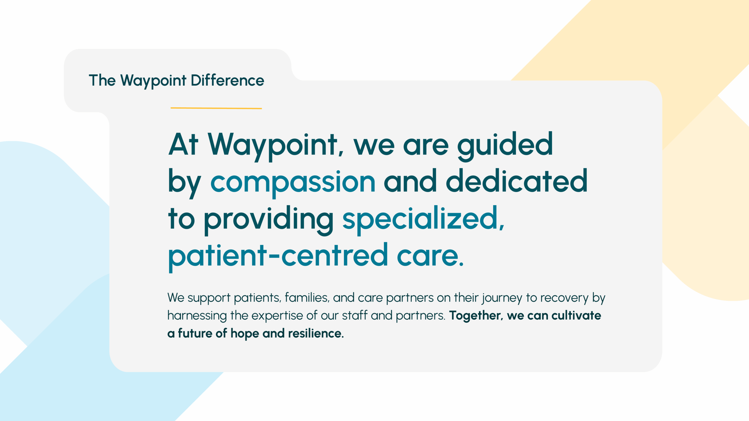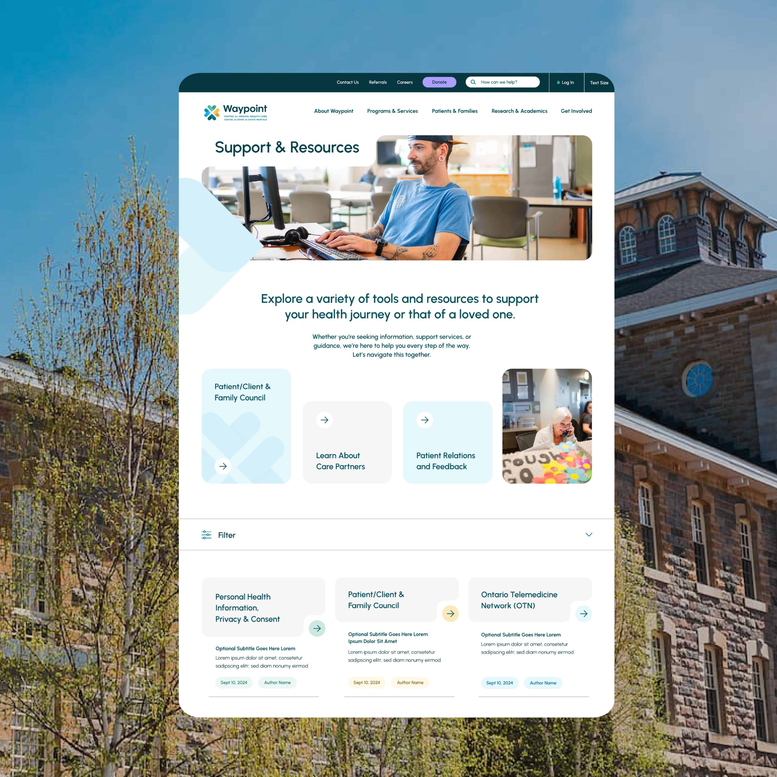 Through stakeholder engagement and research, we identified opportunities to strengthen Waypoint’s public narrative, clarify the patient journey, and reduce stigma. The result is a professional yet warm brand identity and a website that simplifies information, elevates storytelling, and empowers users — positioning Waypoint as both a provider of care and a source of leadership in the mental health space.